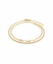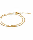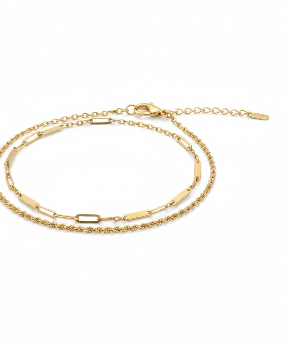 Double Layer Design: Features two perfectly layered chains for an instant stacked look.One layer is a traditional Rope Chain.The second layer is a contemporary Paperclip Link Chain.Premium Material: Made from Stainless Steel for superior strength and hypoallergenic properties.High Quality Finish: Ensures a long-lasting, brilliant gold shine.Adjustable Fit: Equipped with a lobster clasp and an extender chain for a comfortable, customized fit around the ankle.Versatile: Can be styled as a bracelet (depending on wrist size) or worn as a fashionable double-layer anklet.FeatureDetailMaterialStainless SteelLayersDouble LayerChain TypesRope Chain and Paperclip Link ChainQualityHigh QualityClaspLobster Clasp with Extender