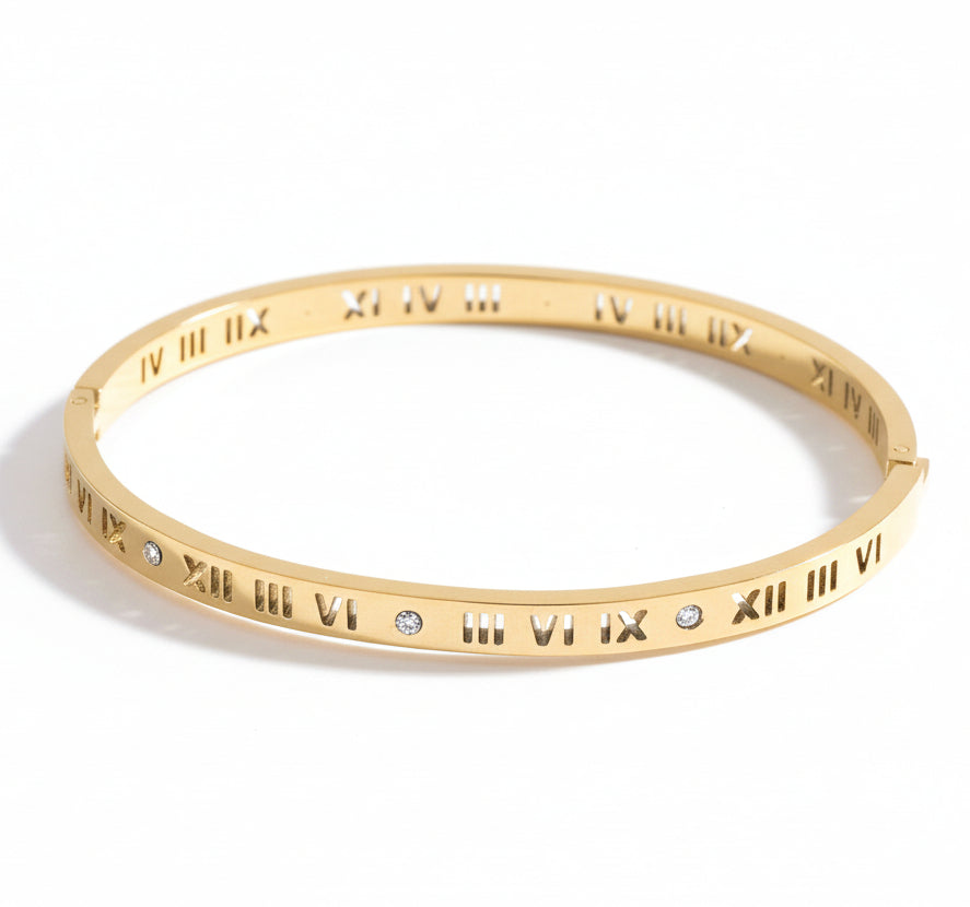 Classic meets contemporary with this sophisticated Roman Numeral Bangle. Featuring etched Roman numerals and delicate crystal accents, this sleek cuff offers a timeless "quiet luxury" aesthetic that is perfect for stacking or wearing as a standalone statement.