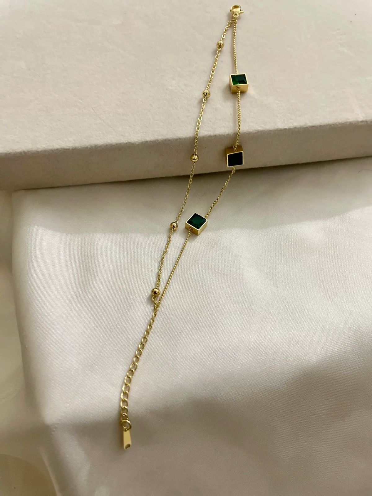 Layered Design: Features a delicate golden bead-accented chain paired with a second strand of bold, geometric emerald-colored stones.