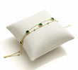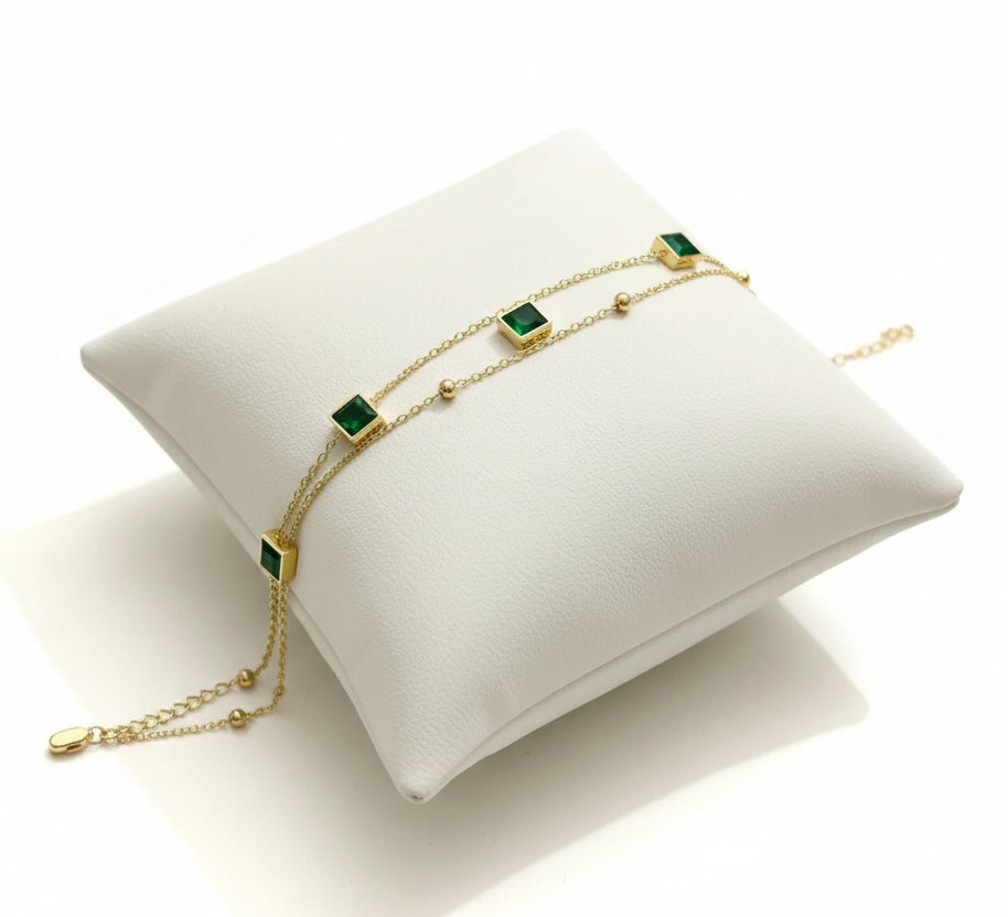 A sophisticated statement piece that blends modern layering with royal elegance. This Double Layer Emerald Bracelet features vibrant green stones that provide a stunning contrast against a radiant golden finish.