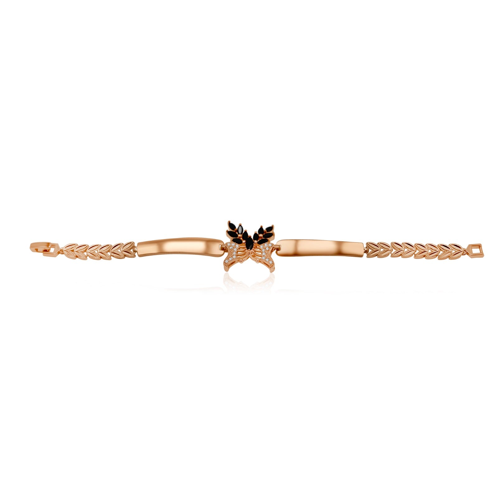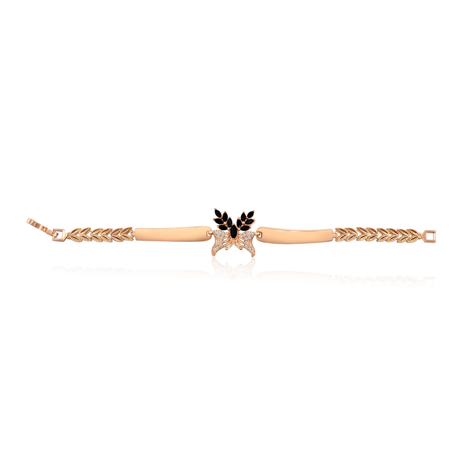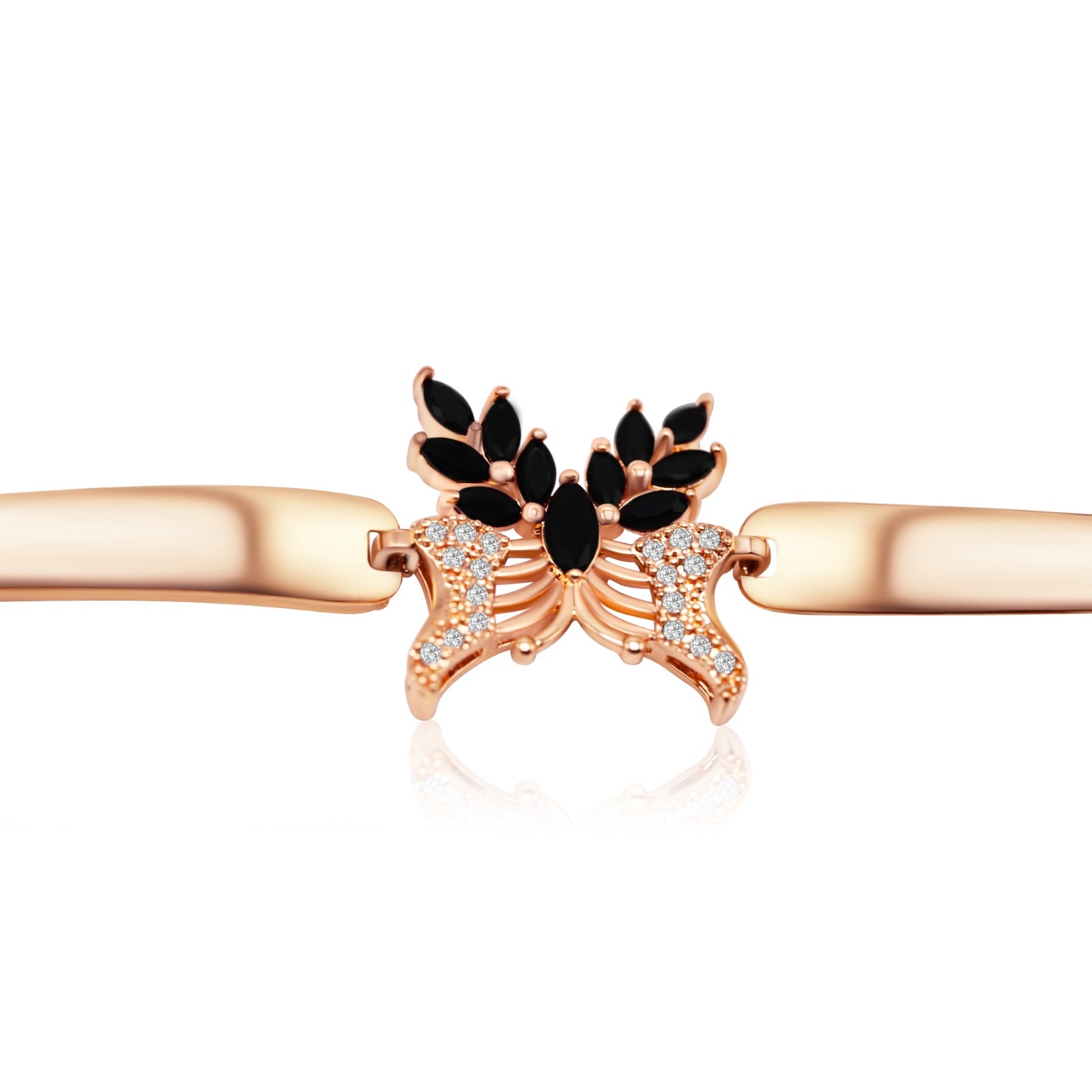 Embrace transformation and grace with the Gemstone Butterfly Bracelet. This elegant piece captures the delicate beauty of a butterfly, rendered in a sophisticated rose gold-tone finish. The intricate centerpiece features marquise-cut black crystals forming the wings, accented by sparkling clear crystals along the lower edges. The band is a chic combination of a polished bar and unique link chains (or a full link chain, depending on the variant shown in the images). This bracelet adds a touch of subtle drama and whimsical luxury to your wrist, perfect for elevating any daytime or evening look.