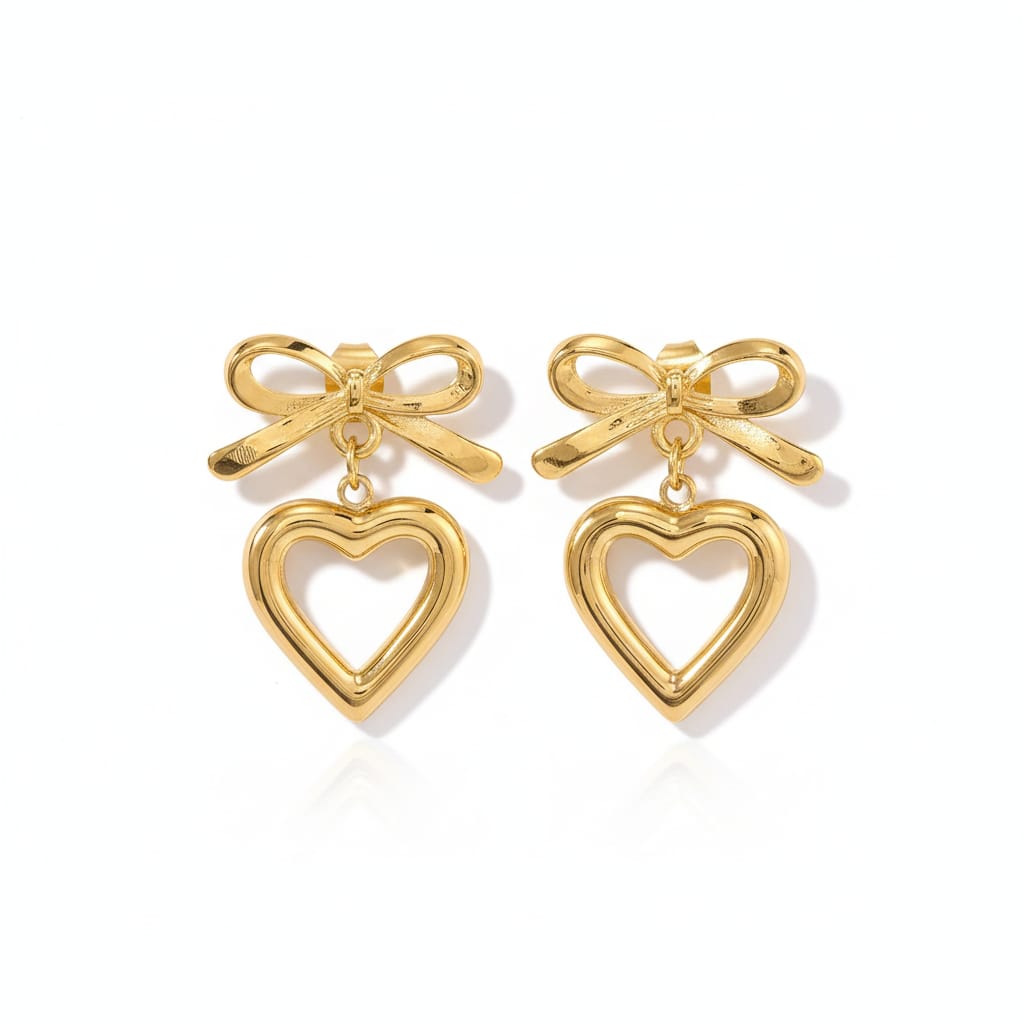 Add a touch of playful romance and sophistication to your look with our Sweetheart Bow Drop Earrings. These enchanting gold-tone earrings feature a polished, three-dimensional bow stud from which a beautiful hollow heart pendant is suspended. The open-heart design catches the light beautifully, creating an elegant silhouette that is both youthful and chic. Perfect for day or night, these earrings are a charming expression of affection and style, making them an ideal gift for a loved one or a dazzling treat for yourself.