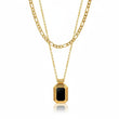 Make a bold statement with our Chic Layered Figaro & Tag Necklace. This pre-layered piece combines the classic appeal of a chunky Figaro chain with a finer, delicate chain, leading to a striking rectangular pendant. The pendant features a sleek black inlay framed by a ribbed gold border, creating a modern and luxurious focal point.