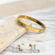 Handcuff Style: Designed as a rigid, non-flexible cuff that encircles the wrist, providing a substantial feel and a contemporary, locked look.Embossed Screw Motifs: Detailed with decorative screw or oval motifs embossed around the entire surface, giving the bangle a unique, highly recognizable texture.Premium Gold Finish: Crafted from a durable base metal and finished with a high-quality Gold-Tone Plating to ensure a brilliant, long-lasting golden color.Secure Closure: Features a seamless, hinged mechanism that clicks shut securely, ensuring the cuff stays locked firmly on the wrist when worn.Available Sizes: Offered in sizes 16, 17, 18, and 19 (typically wrist circumferences in centimeters) to help you find the perfect rigid fit.📏 SizingSizeStyle16Smaller, Snug Fit17Standard Fit18Relaxed Fit19Larger Fit