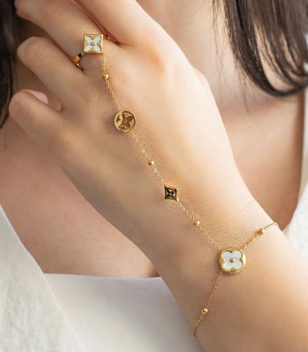 Step into a world of enchanting elegance with our Golden Clover Hand Chain with Ring. This exquisite piece beautifully merges the delicate charm of a bracelet with the unique style of a ring, all connected by a graceful beaded chain. The design features a series of captivating four-leaf clover motifs—some with a luminous mother-of-pearl inlay, others with a sleek gold-tone finish—symbolizing luck and sophistication. Crafted with a brilliant gold-tone plating and an adjustable fit, this hand chain is a unique accessory that adds a touch of bohemian chic and refined luxury to any look. Perfect for making a statement at special events or elevating your everyday style.