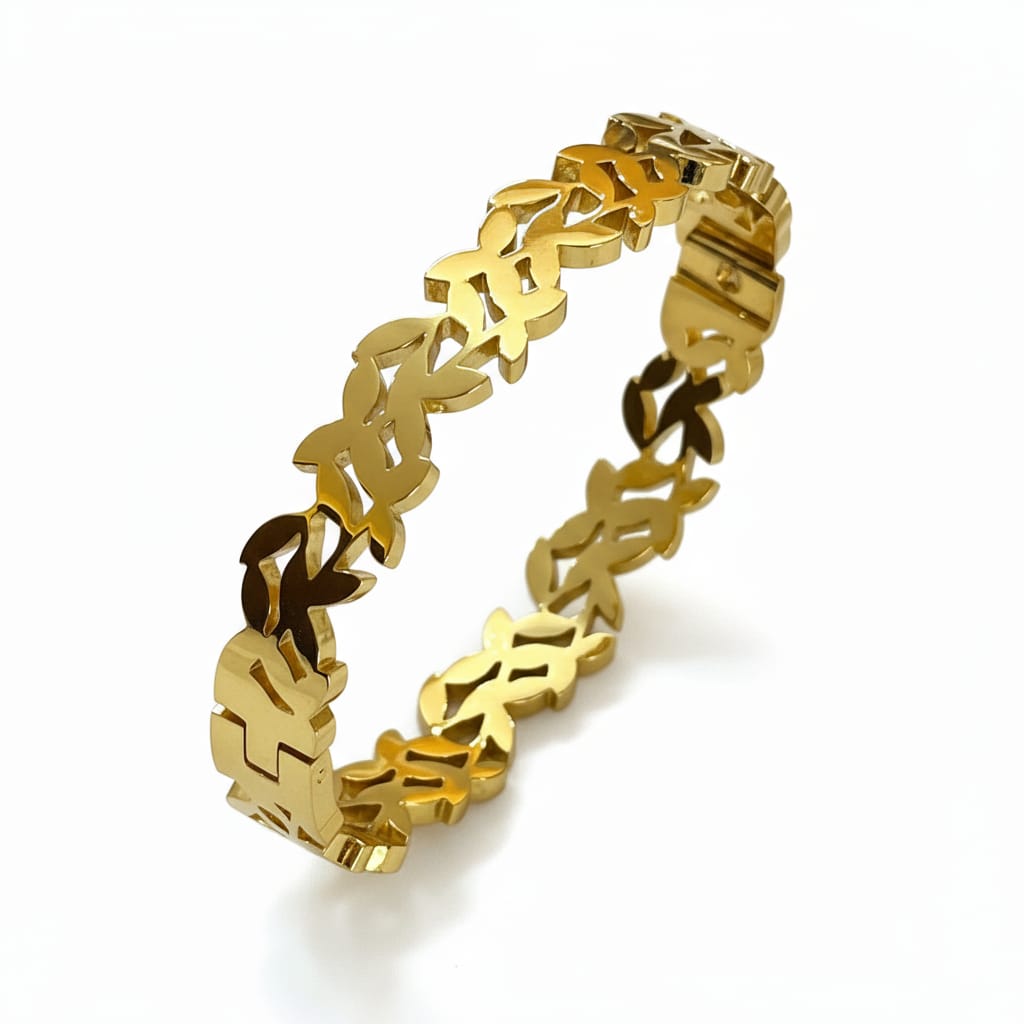 This elegant Leaf Bangle is a perfect blend of nature-inspired beauty and modern sophistication. Designed with a seamless pattern of delicately interlocked leaf motifs, it offers a fresh, graceful, and feminine aesthetic. The high-shine finish enhances its smooth, polished look—making it a timeless accessory that elevates both everyday outfits and special-occasion ensembles.