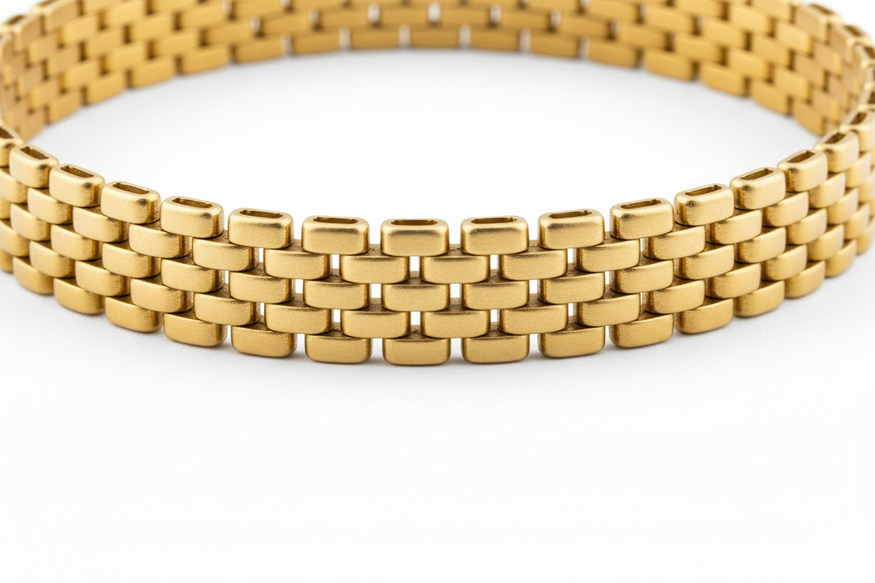 Elevate your wristwear with the timeless elegance of The Classic Mesh Link Bracelet. This luxurious bracelet features a wide, flexible band constructed from three parallel rows of sleek, interlocking square or rectangular links, creating a stunning woven, brick-like texture. The high-polish gold-toned finish reflects light beautifully, giving it the substantial look and feel of a high-end watch strap. It's the perfect accessory for adding structure and sophistication to any professional or evening ensemble.