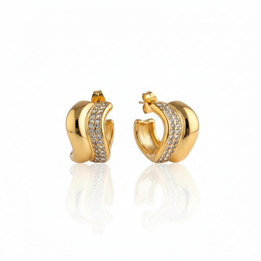 The Pave Curve Hoop Earrings offer a perfect blend of modern boldness and brilliant sparkle. These statement hoops feature a wide, chunky curve design crafted in a polished gold tone that ensures maximum shine. Each earring is illuminated by two parallel rows of dazzling pave-set clear crystals, adding a luxurious band of light to the contemporary silhouette. Comfortable to wear and secured with a classic post back, these earrings are the ultimate accessory for adding sophisticated glamour to any look, whether worn in the daytime or for a dazzling evening out.