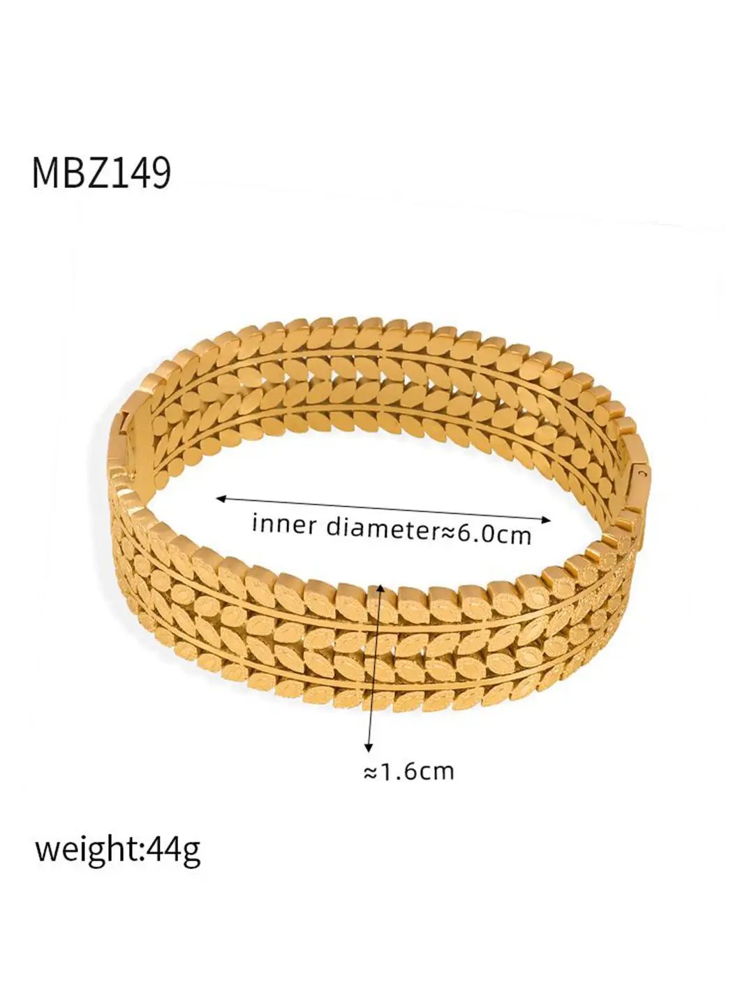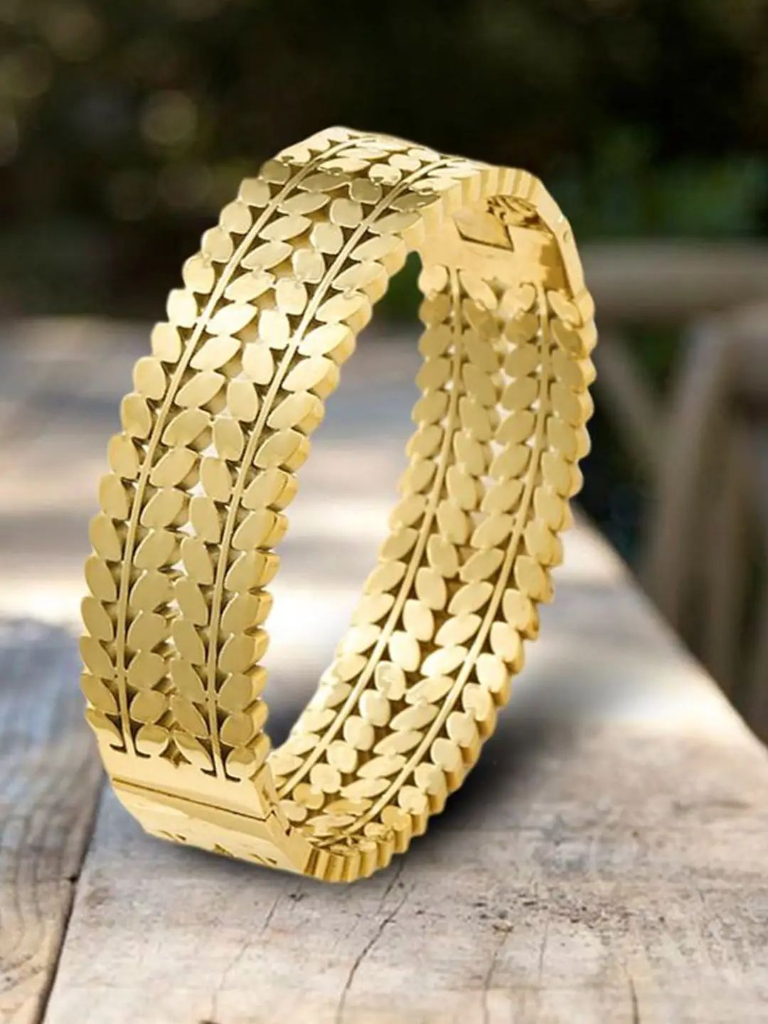 Embrace nature's elegance with The Golden Vine Leaf Statement Cuff. This luxurious, wide bangle is a magnificent piece of wearable art, featuring a bold, intricate all-over cutout design of interconnected, stylized leaves. The delicate filigree work is contrasted by the substantial width of the cuff, creating a unique play of light and shadow that truly captures attention. Finished in a high-polish, rich gold tone, this bangle adds sophisticated texture and organic glamour to any ensemble.