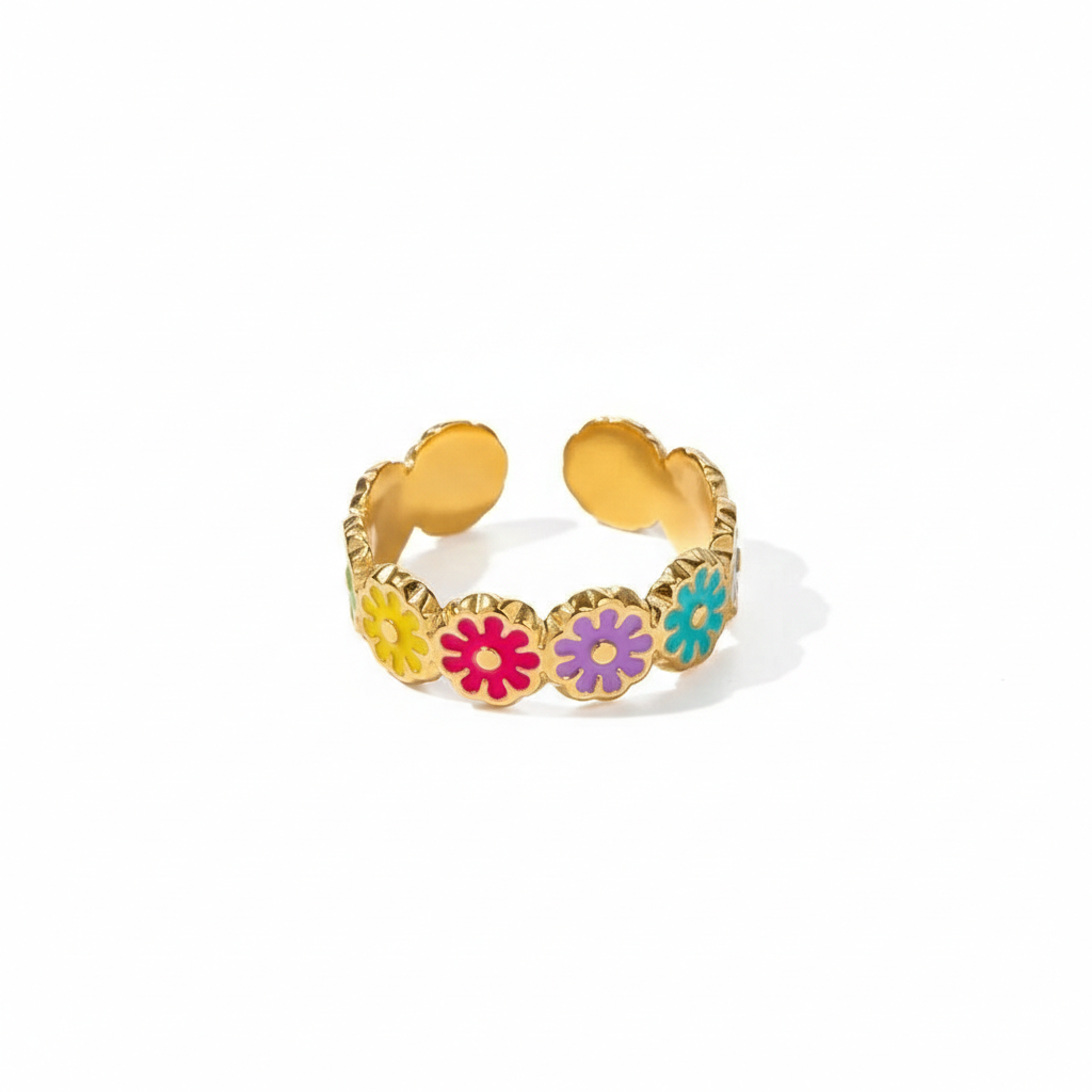 Add a touch of playful elegance to your jewelry collection with these vibrant Daisy Bloom rings. Featuring a charming floral motif and a luxurious gold-tone finish, these adjustable rings are designed to be worn alone for a minimalist look or stacked together for a bold, colorful statement.