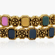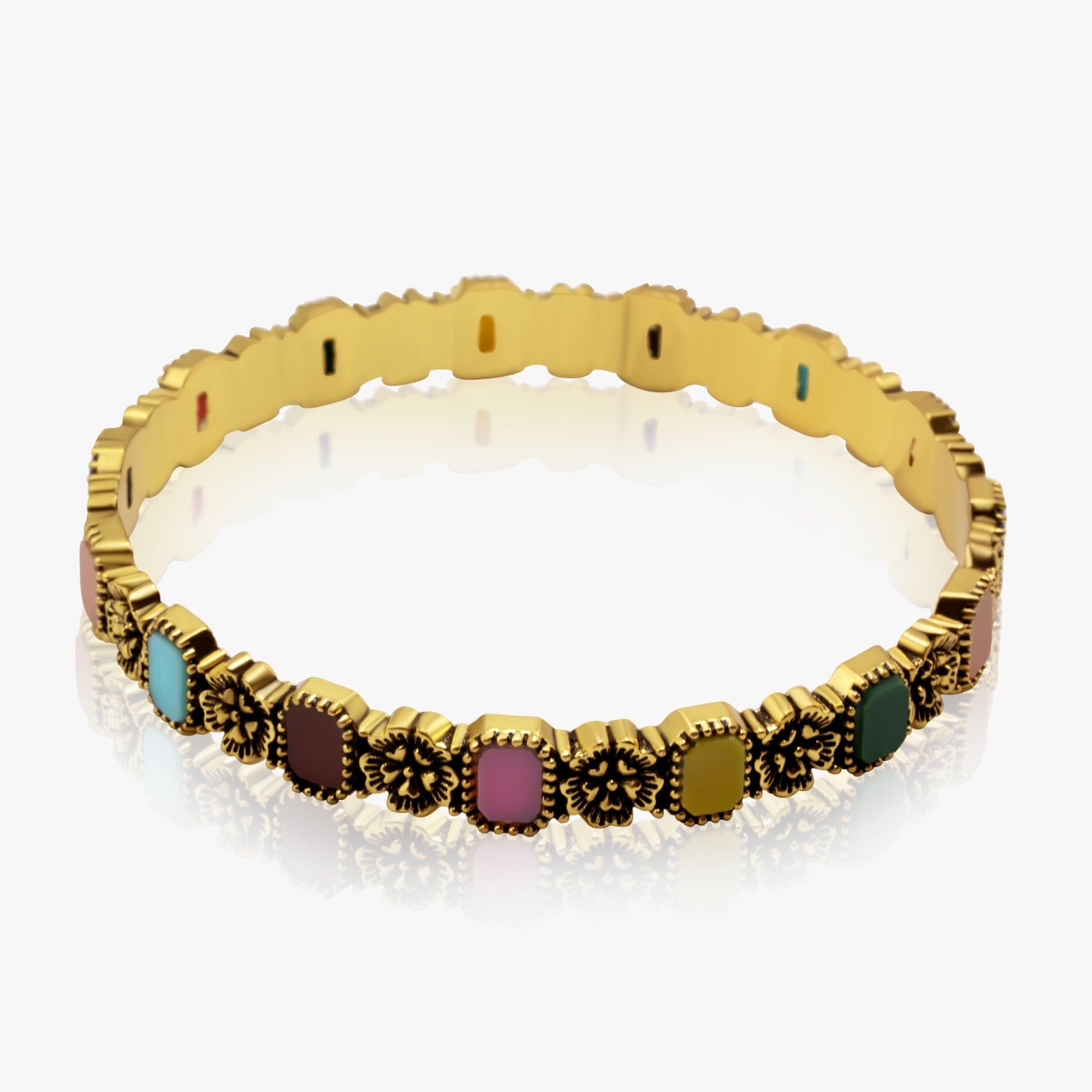 Stone-Embellished BangleThis exquisite bangle is a true celebration of vibrant color and classic artistry. Featuring a beautiful arrangement of richly colored, rectangular stones set within a detailed, scalloped, and floral-inspired border,