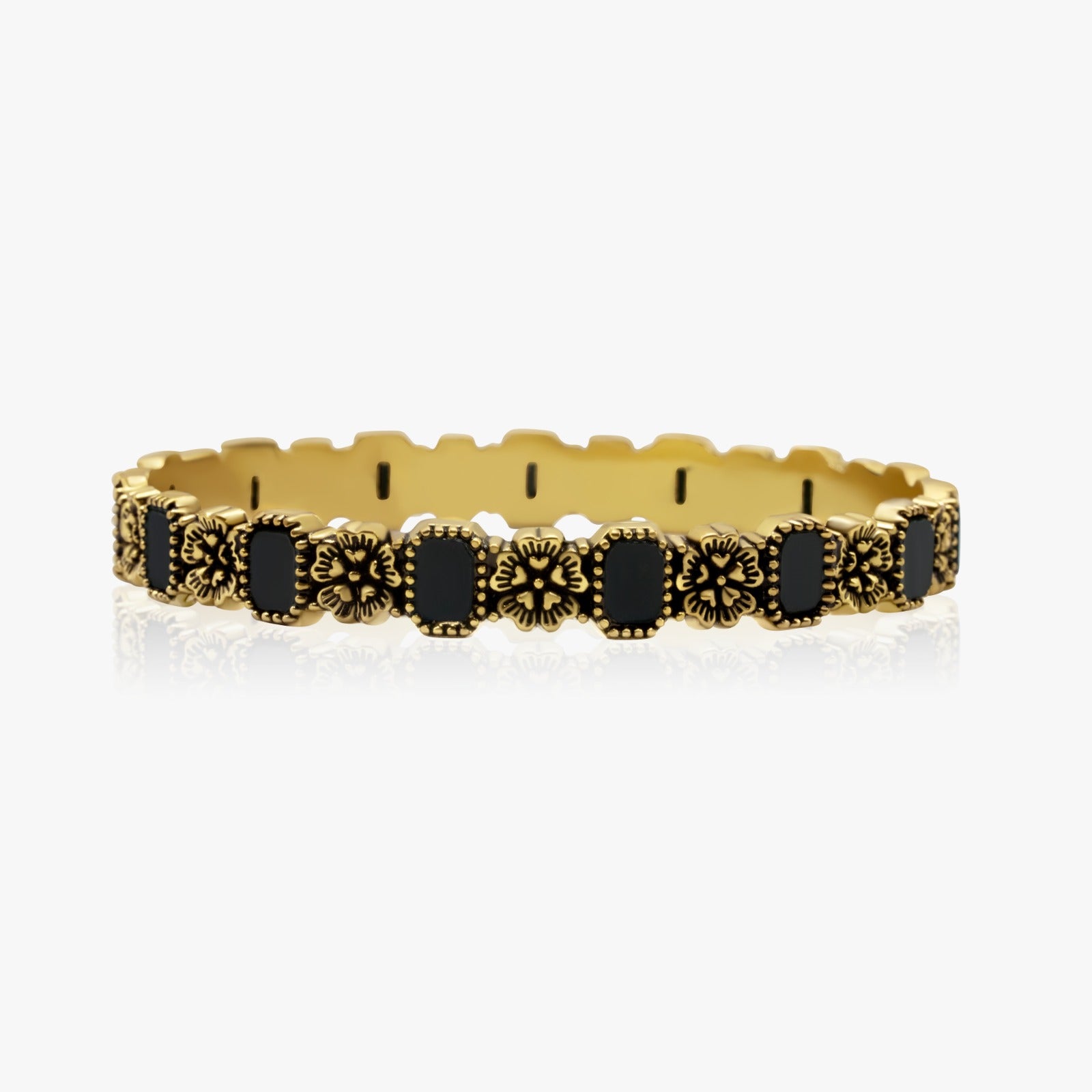 Designed for those who appreciate intricate detailing and a touch of dramatic color, this bangle blends traditional sophistication with contemporary flair—the perfect accessory when you want all eyes on your wrist.