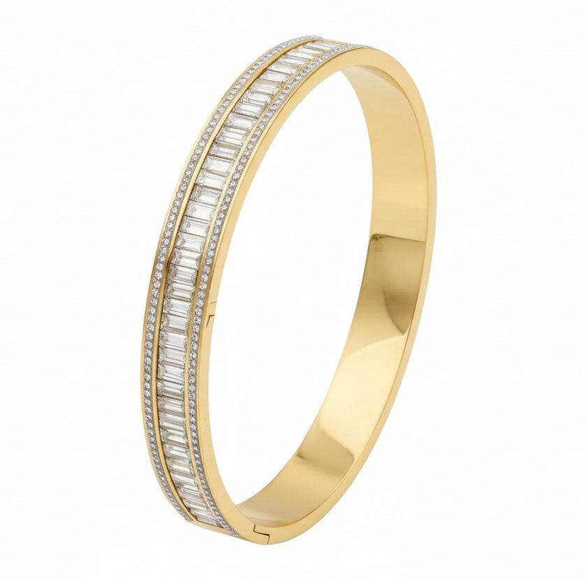 high-glam statement piece featuring a brilliant row of baguette-cut crystals framed by a shimmering border. This sleek, polished bangle is designed for a luxurious "quiet luxury" look.