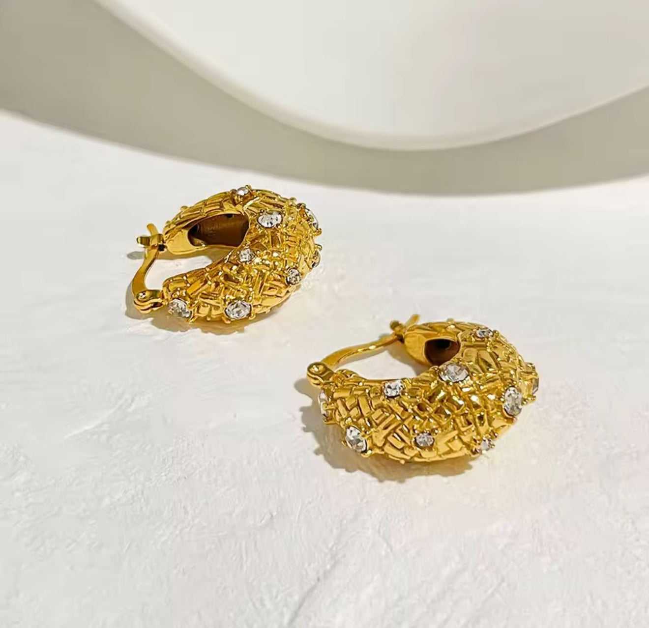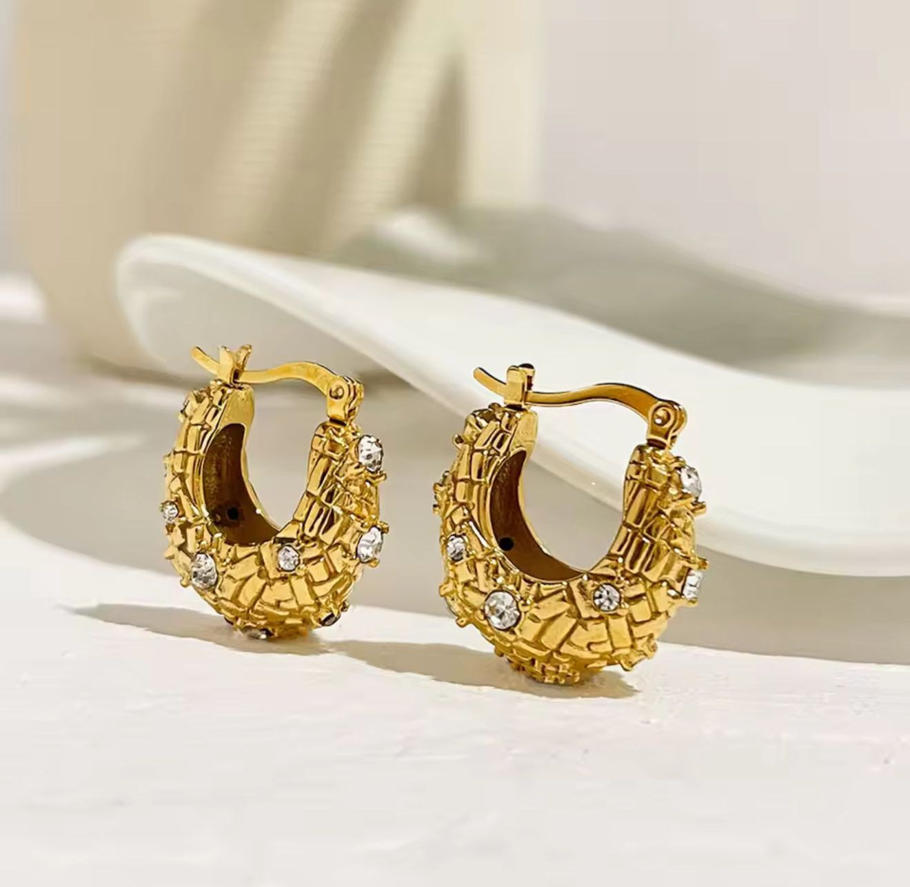 Embrace bold texture and brilliant sparkle with our Textured Luxe Crystal Huggie Hoops. These contemporary earrings feature a unique, organic, and intentionally distressed gold-tone finish that sets them apart from smooth designs. The rich texture is beautifully contrasted with strategically placed miniature crystals and small pearls (in one version), adding a subtle shimmer and eye-catching detail. The comfortable huggie style means they sit close to the earlobe, making them perfect for both statement daytime wear and glamorous evening events. They are the ideal accessory to inject modern artistry and luxury into your look.
