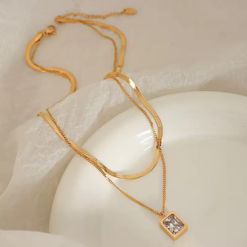 Add a touch of contemporary luxury to any look with our Regal Layers Pendant Necklace. This striking piece features a trendy double-layered design for effortless styling and maximum impact. The first layer is a delicate chain, perfectly complemented by a second, slightly longer chain featuring a bold, rectangular-cut gemstone pendant. Available in two essential colors—Deep Emerald Green and Brilliant Clear White—this necklace is the perfect blend of classic elegance and modern trend, making it a must-have accessory for daily wear or evening glam.